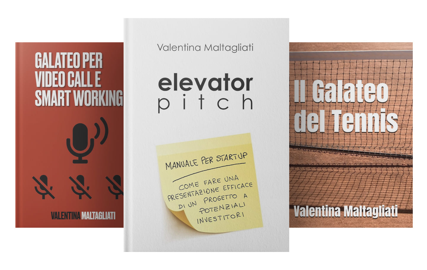 Sono autrice di quattro libri disponibili su Amazon: "Elevator Pitch", "Galateo per video call e smart working", "La Stanza Bianca" e "Il Galateo del Tennis". Ogni libro nasce da un’esperienza vissuta e dal desiderio di trasformare la comunicazione in uno strumento di crescita, sia professionale che personale.
